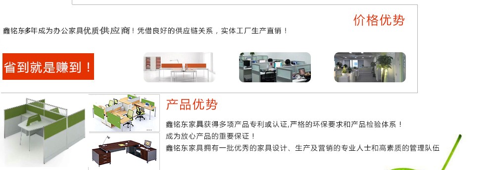 深圳市鑫銘東家具有限公司深圳市鑫銘東家具有限公司專業(yè)銷售各類辦公家具!產(chǎn)品涉及多種系列,如:班臺、班椅、屏風、會議桌、會議椅、辦公沙發(fā)、茶幾、辦公桌、文件柜、電腦桌椅、各式餐臺、餐椅、書柜等辦公家具。 鑫銘東家具擁有一批優(yōu)秀的家具設計、生產(chǎn)及營銷的專業(yè)人士和高素質(zhì)的管理隊伍。銘東家具以"先難后易"之戰(zhàn)略,在產(chǎn)品結(jié)構、產(chǎn)品質(zhì)量及服務水平方面,均推陳出新,力求完善,精益求精。使我們的產(chǎn)品質(zhì)量保持在國內(nèi)外家具潮流的先進水平,力求滿足客戶的特殊需求。鑫銘東家具多年來致力于環(huán)保、實用家具的設計與開發(fā),集生產(chǎn)、銷售、服務于一體。本著"以人為本"的設計理念,大量開發(fā)符合人體工程學的各種產(chǎn)品,以"誠信為本"的質(zhì)量方針,真材實料,認認真真做產(chǎn)品,實實在在做人。鑫銘東家具更致力于創(chuàng)造"零維修率"的制造境界,實現(xiàn)"沒有維修的服務才是最好服務"的口號》了解更多 |